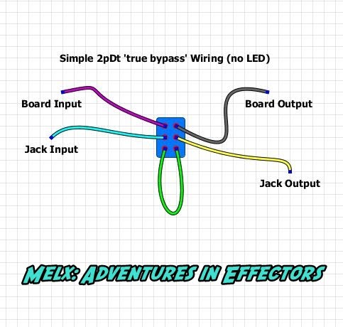 In addition, I want to use this as an effect in my pedalboard, ie I need a locking footswitch. I have a DPDT latching switch that’ll do just the job, but my head is going fuzzy trying to figure out where to wire it in. I’m looking at this schematic taken from Melx’s blog: